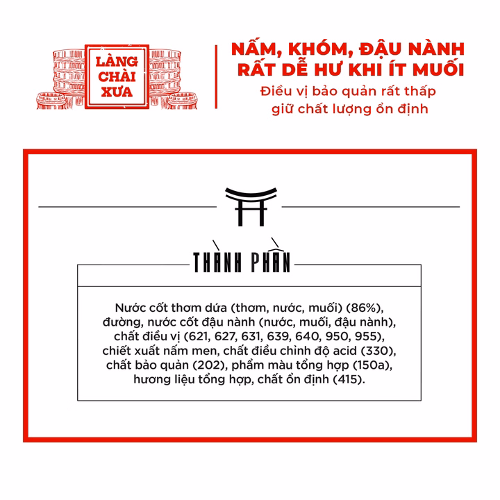 Thành phần chính trong nước mắm: Nấm ngọt Shiitake, đậu nành Nhật Bản, nước cốt thơm dứa, muối tinh khiết và đường phèn tự nhiên