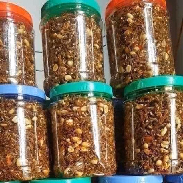 👉 Thành phần: 50% cá cơm sữa, 50% lạc ( đậu phụng) , vừng (mè) đường, muối, bột ngọt, tỏi, ớt…