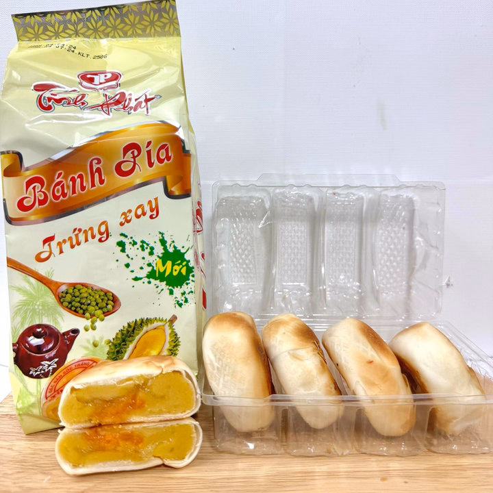 Bánh pía trứng xay nhân đậu xanh sầu riêng, 1 túi 250gr có 4 cái liền bên trong, mỗi chiếc bánh tròn tròn xinh xinh, trứng