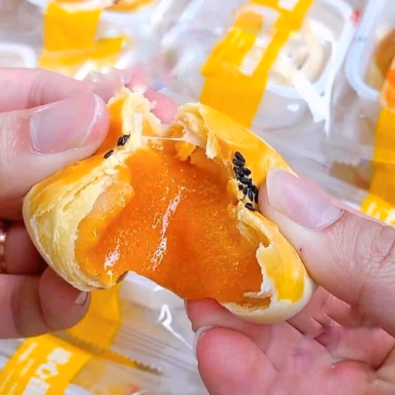 👉 Ở giữa là nhân trứng muối đậm đà, tan chảy khi bẻ đôi chiếc bánh cực kỳ hấp dẫn.
