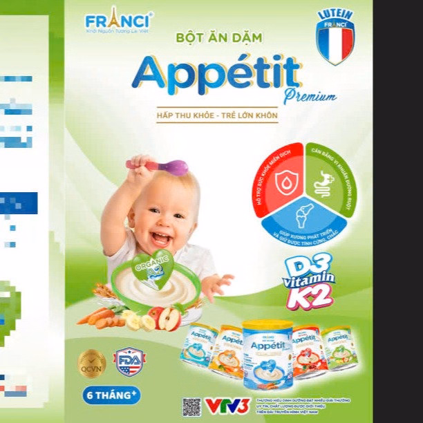 Bột ăn dặm Appetit thích hợp cho trẻ trong giai đoạn tập ăn dặm, không những đa dạng hương vị thơm ngon mà còn cung cấp đầy đủ dinh dưỡng để con phát triển toàn diện. Bột ăn dặm Appetit chứa các chất dinh dưỡng như: