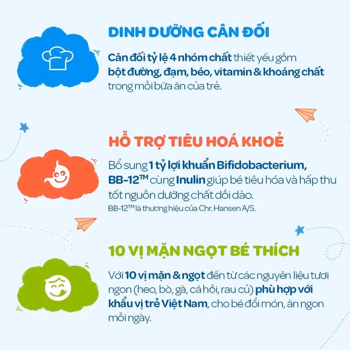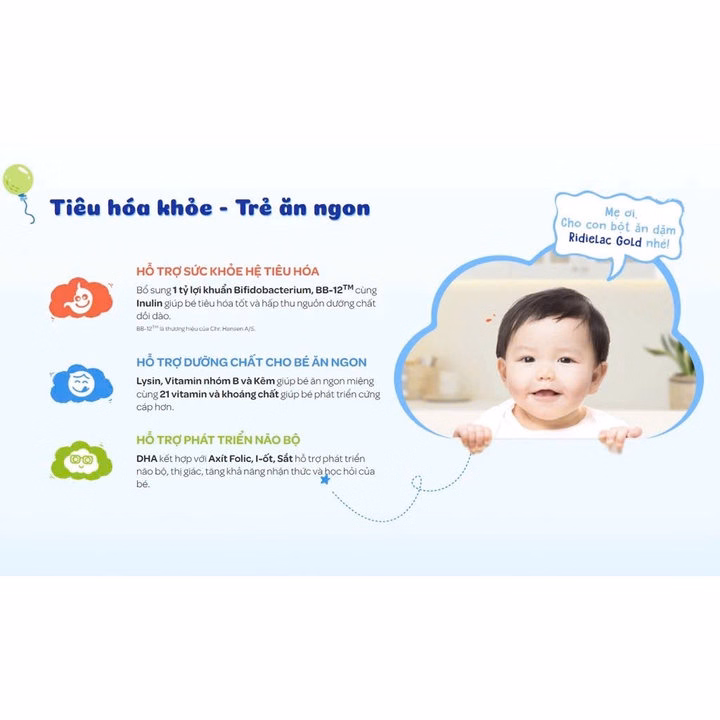 Bổ sung lợi khuẩn Bifidobacterium, Bb-12tm cùng chất xơ hòa tan inulin giúp tăng vi khuẩn có lợi, ức chế vi khuẩn có hại, hỗ trợ tốt sức khỏe hệ tiêu hóa, giúp bé hấp thu nguồn dưỡng chất dồi dào, cho bé phát triển thể chất khỏe mạnh.