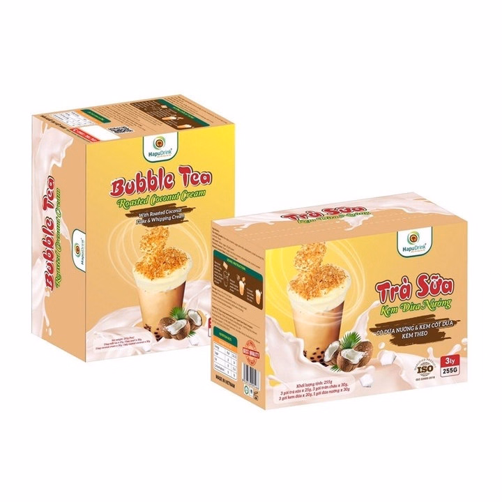 + Trà sữa kem dừa nướng 255g ( 3 ly) : Gồm 03 gói trà sữa + 03gói kem dừa + 03gói chân châu và 1 gói dừa nướng