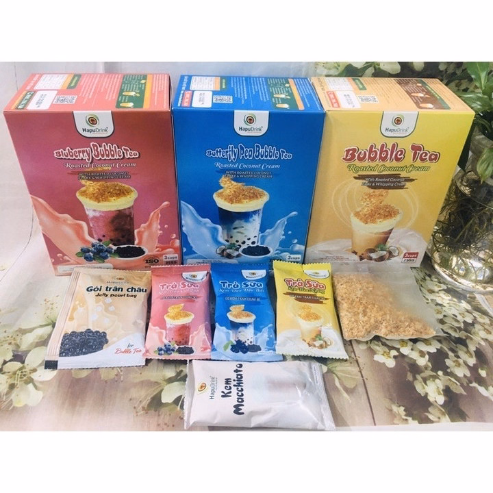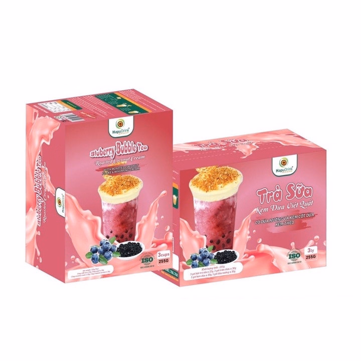 + Trà sữa kem dừa Việt quất 255 ( 3 ly) Gồm 03 gói trà sữa + 03gói kem dừa + 03gói chân châu và 1 gói dừa nướng