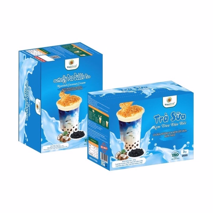 + Trà sữa kem dừa đậu biếc 255g ( 3 ly)Gồm 03 gói trà sữa + 03gói kem dừa + 03gói chân châu và 1 gói dừa nướng