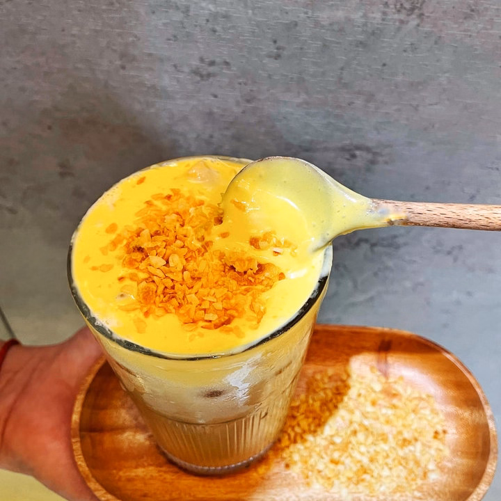 => Cách pha: Cho 01 gói trà sữa vào ly + 100ml nước sôi + 200ml đá + cho trân châu vào lúc cho đá sẽ giòn, ngược lại cho vào lúc nóng trân châu sẽ dẻo. Sau đó cho 20ml nước sôi vào kem dừa đánh tan sau đó chan lên bề mặt trà sữa tạo khối 2 màu và rắc vụng dừa lên trên