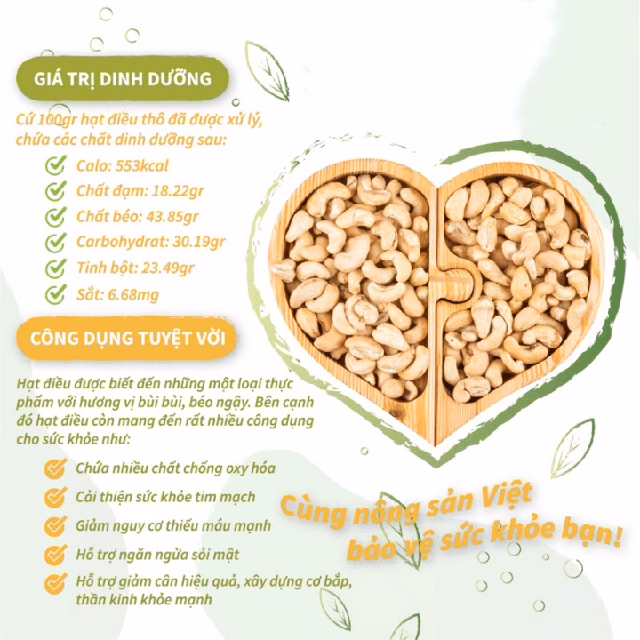 • Thành phần: 99% hạt điều, 1% muối tinh