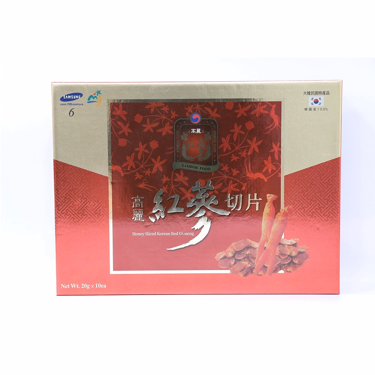 Hồng sâm Hàn Quốc thái lát tẩm mật ong Sambok với thành phần là hồng sâm 6 năm tuổi được chế biến bằng phương pháp hấp cách thủy, rồi được thái lát tẩm mật ong rừng nguyên chất do nông trường Sambok sản xuất.