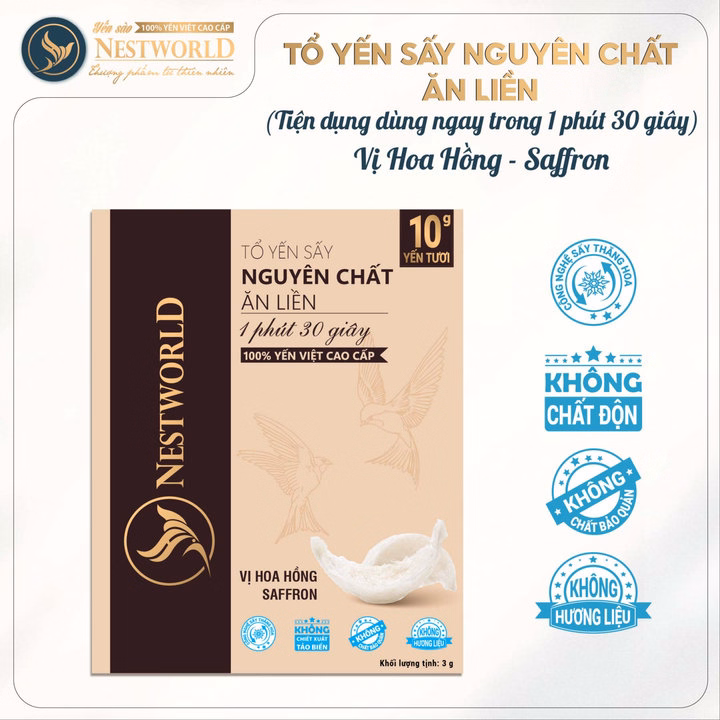 Ứng dụng công nghệ sấy thăng hoa hiện đại, sản phẩm vẫn giữ nguyên hương vị và trọn vẹn dưỡng chất có trong tổ yến nguyên chất , với nguồn nguyên liệu tổ yến Việt tự nhiên được khai thác trực tiếp từ hệ thống nhà yến đạt chất lượng trên toàn quốc của Nestworld, đảm bảo 4 Không: