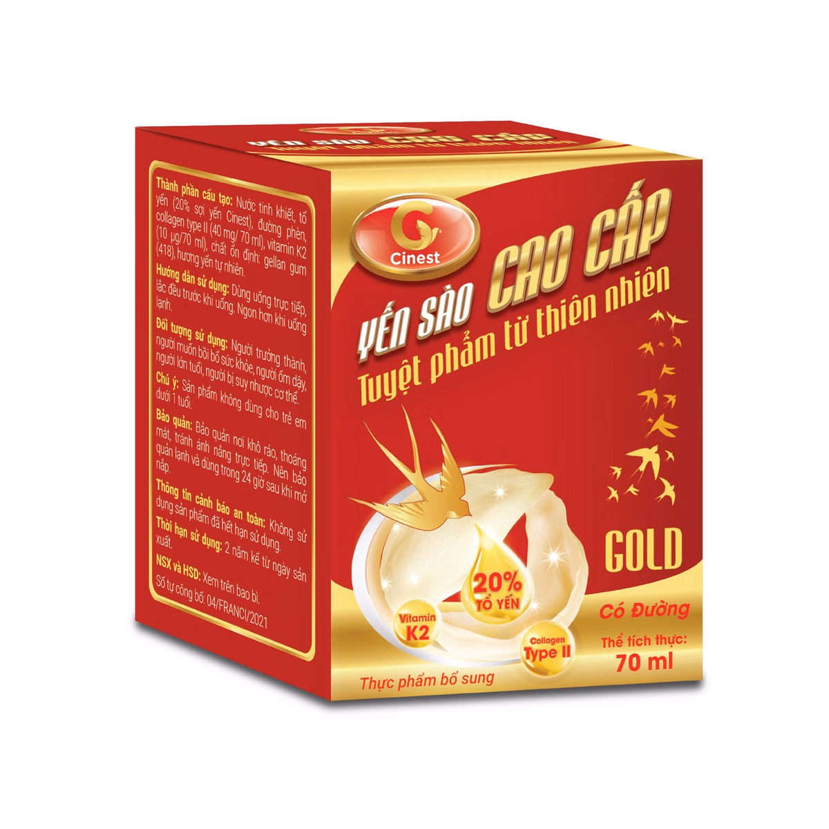 Thành phần: Nước tinh khiết, tổ yến (20% sợi yến Cinest), đường phèn, collagen type 2 (40g/70ml), vitamin K2, chất ổn định: gellan gum (418), hương yến tự nhiên