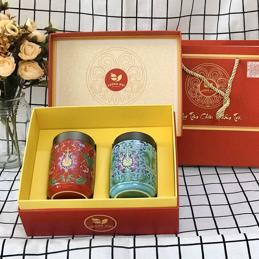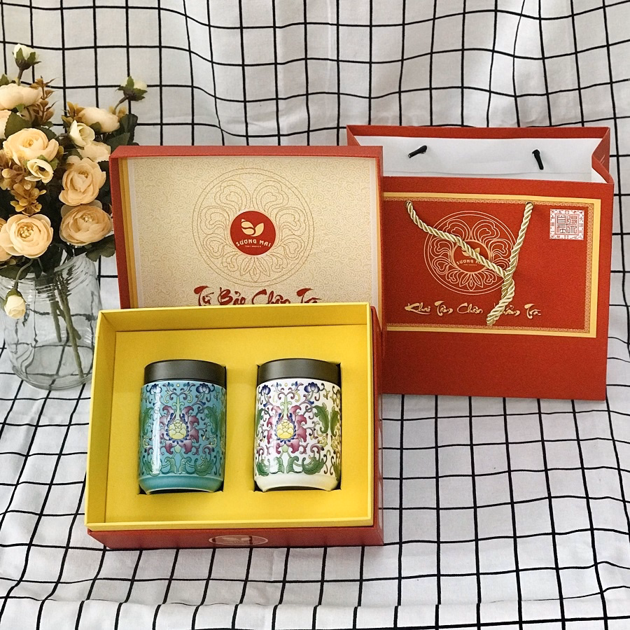 Bộ sản phẩm Hộp quà tặng Sương Mai – Khai Tâm Tứ Phẩm Trà Vip gồm: 1 lọ trà bằng gốm pháp lam cực đẹp, bên trong là trà cực phẩm năm trong bộ Tứ Bảo Chân Trà có các màu đỏ, xanh, vàng, trắng để quý trà lựa chọn màu phù hợp với phong thủy. 1 hộp lớn sang trọng đựng 2 lọ và 1 túi giấy rất đẹp.