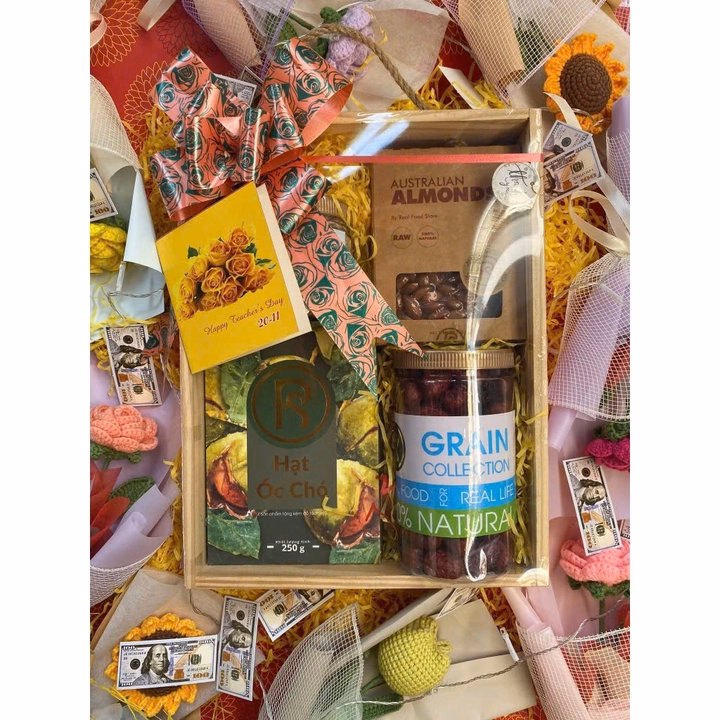 Wooden Giftset được làm từ hộp vân gỗ mộc mạc và bình dị. Món quà là sự kết hợp tuyệt vời từ 4 loại hạt khác nhau.