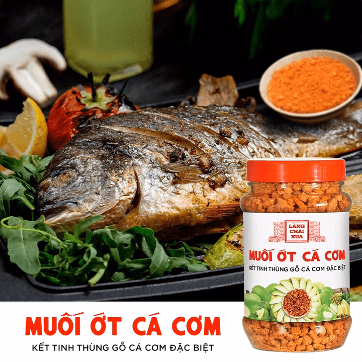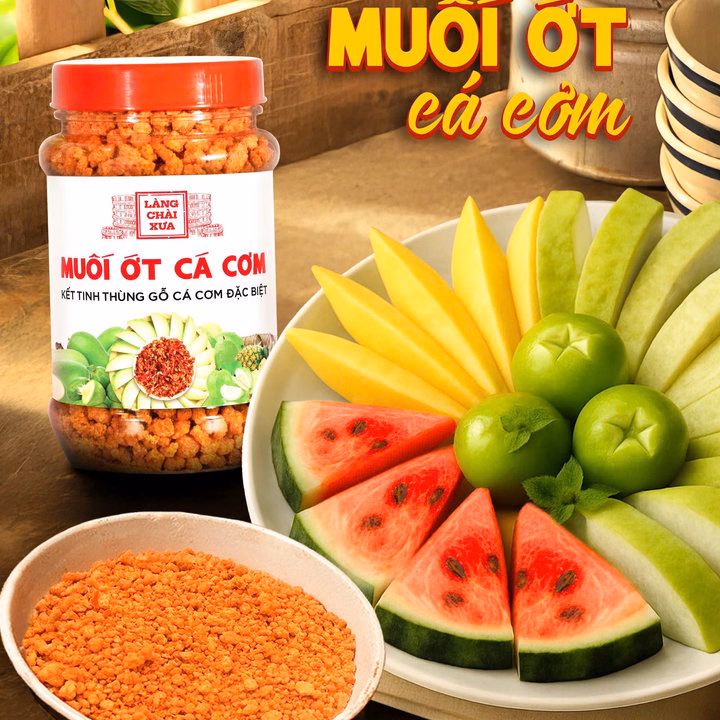 – Muối ớt cá cơm được làm theo công thức 300 năm của Làng Chài Xưa rất độc đáo và thơm ngon. Đây là loại muối kết tinh từ thùng gỗ truyền thống trong quá trình ủ chượp nước mắm cá cơm. Các hạt muối có chứa thịt đạm cá cơm được rang sấy với ớt và gia vị tạo nên một loại muối chấm rất đặc biệt. Muối ớt cá cơm phù hợp với chấm trái cây cóc, ổi, xoài, thơm và với bánh tráng trộn, gà hấp, cá nướng hay ướp gia vị thịt nướng. Hãy cảm nhận hương vị thơm ngon tự nhiên !!