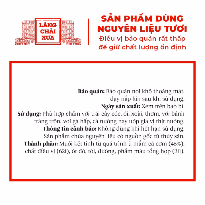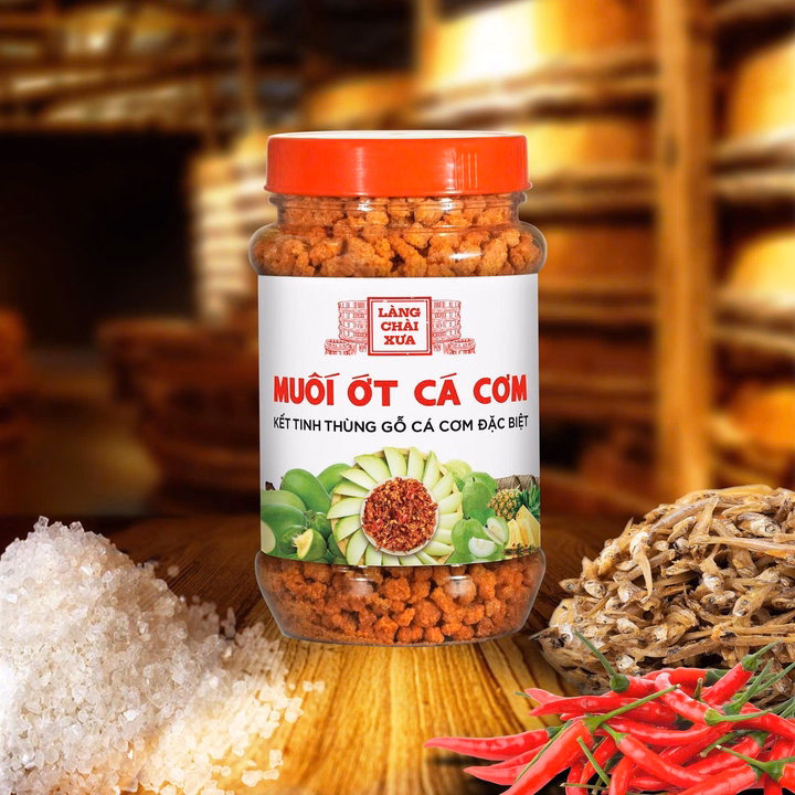 Muối ớt cá cơm Làng Chài Xưa rất thơm ngon, muối kết tinh từ thùng lều gỗ cá cơm đặc biệt, thơm mùi cá cơm, ngọt đạm cá