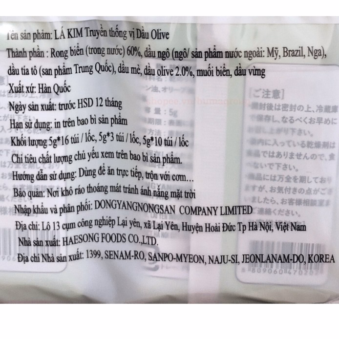 Tên sản phẩm: Lốc 16 gói rong biển ăn liền Lá Kim Truyền Thống Vị Dầu Olive Ctb240 – Bechip
