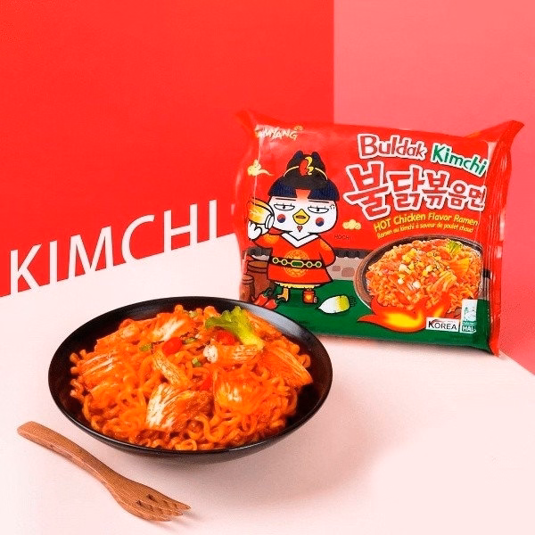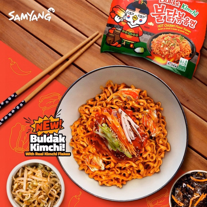 Mì khô gà cay vị kim chi là một trong những sản phẩm nằm trong “bộ sưu tập” mì gà cay nổi tiếng của Samyang. Với sợi mì dai, mềm và vàng óng quyện với nước sốt Buldak cay truyền thống. Và điểm nhấn khác biệt là vị kim chua nhẹ. Gói sốt Buldak kim chi cũng giúp cho dĩa mì có mì vàng cam rất bắt mắt và mùi thơm khó cưỡng.