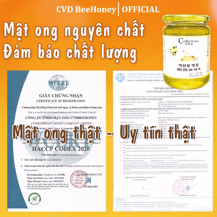 🔴 Được sản xuất bởi Công ty Tnhh Mật Ong Cvdbeehoney, có địa chỉ rõ ràng, giấy chứng nhận Vsattp, Haccp.