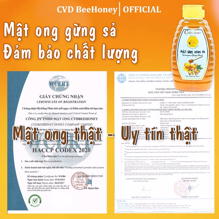 🔴 Được sản xuất bởi Công ty Tnhh Mật Ong Cvdbeehoney, có địa chỉ rõ ràng, giấy chứng nhận Vsattp, Haccp.