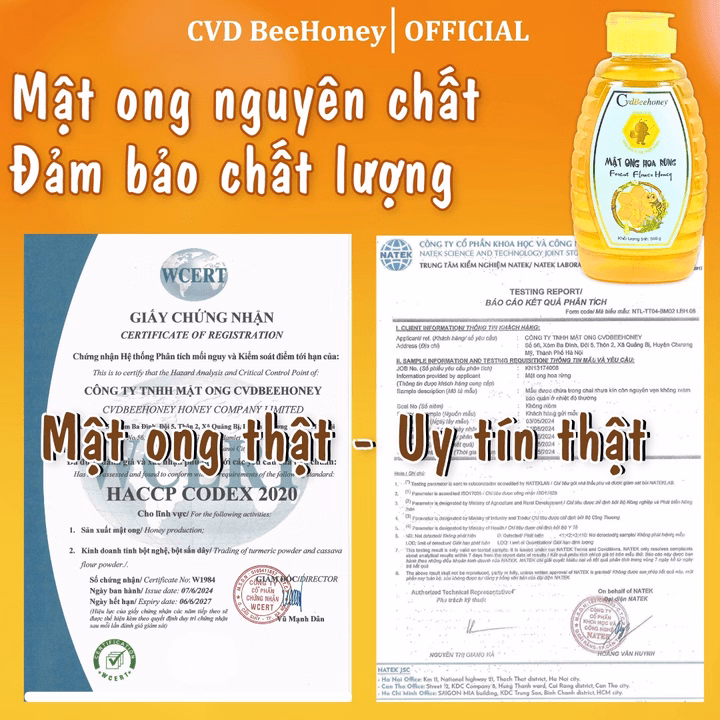 🔴 Được sản xuất bởi Công ty Tnhh Mật Ong Cvdbeehoney, có địa chỉ rõ ràng, giấy chứng nhận Vsattp, Haccp.