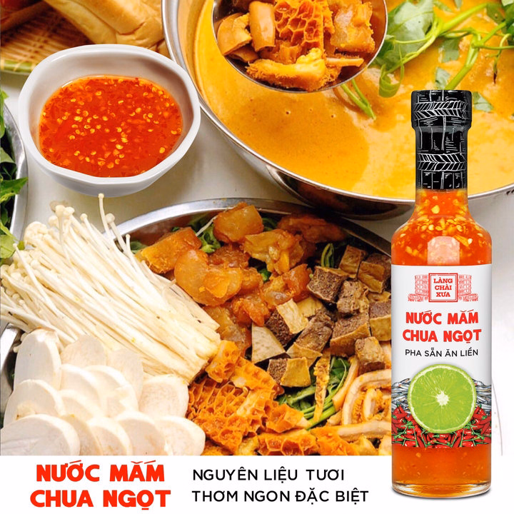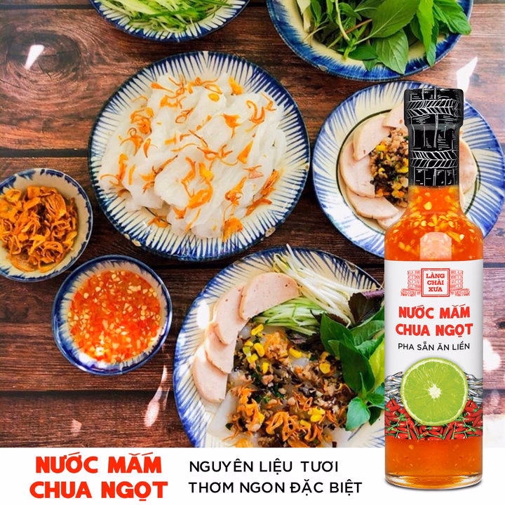 Nước mắm chua ngọt Làng Chài Xưa rất thơm ngon và khác biệt, được làm công phu bằng nguyên liệu chanh, tỏi, ớt tươi. Nước mắm nhỉ cá cơm nguyên chất 40N đạm, ủ thùng gỗ, chanh tươi, tỏi và ớt xiêm tươi hòa quyện nồng nàn giúp món ăn ngon hơn rất nhiều, đặc biệt là cơm tấm sườn nướng hoặc cá cá chiên gỏi xoài. Hãy cảm nhận hương vị thơm ngon tự nhiên.