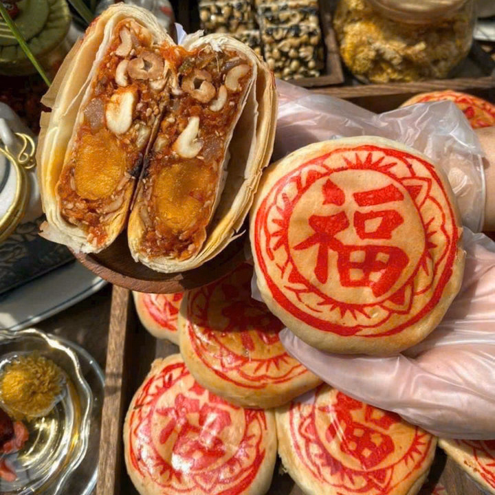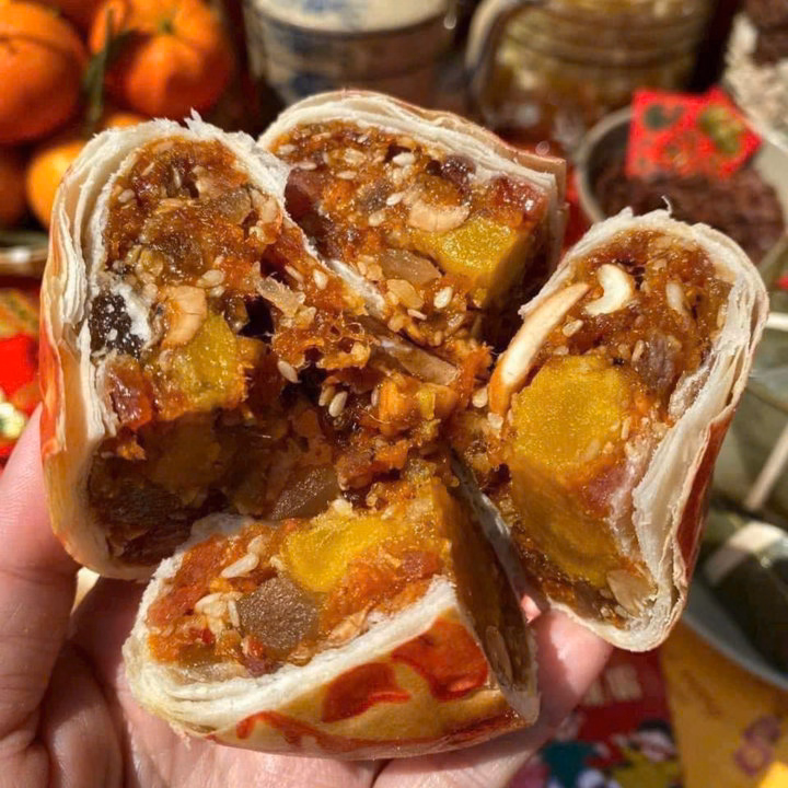 Nhân thập cẩm đậm đà, kết hợp hài hòa giữa lạp xưởng, gà quay, mè trắng, đậu, mứt bí, mỡ heo, bột mì, muối i-ốt… tạo nên vị béo mặn ngọt vừa vặn, ăn là nhớ mãi! 😋