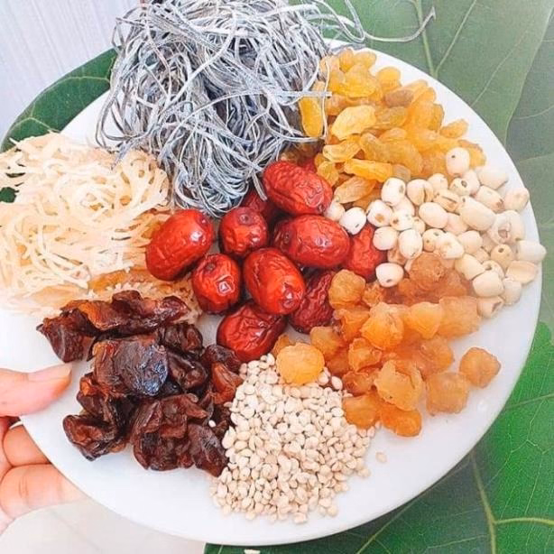 Mỗi sét trọng lượng từ 400-450g bao gồm đầy đủ nguyên liệu như táo đỏ, phổ tai, bạch quả, hạt sen, ý dĩ, rong sụn, hoài sơn, nhãn nhục, nho khô, đường phèn,…