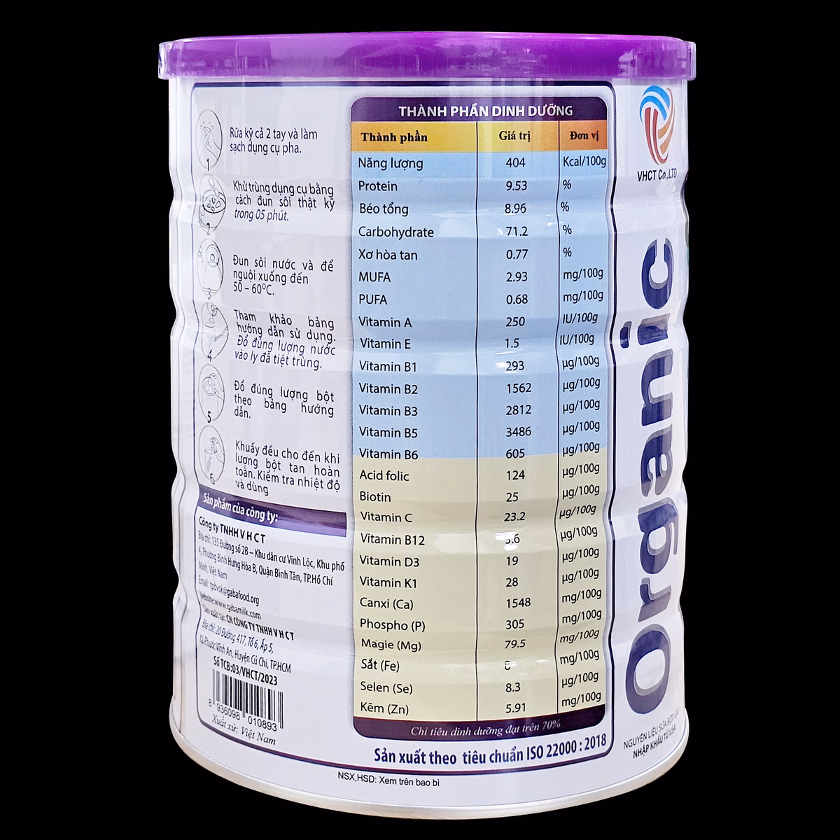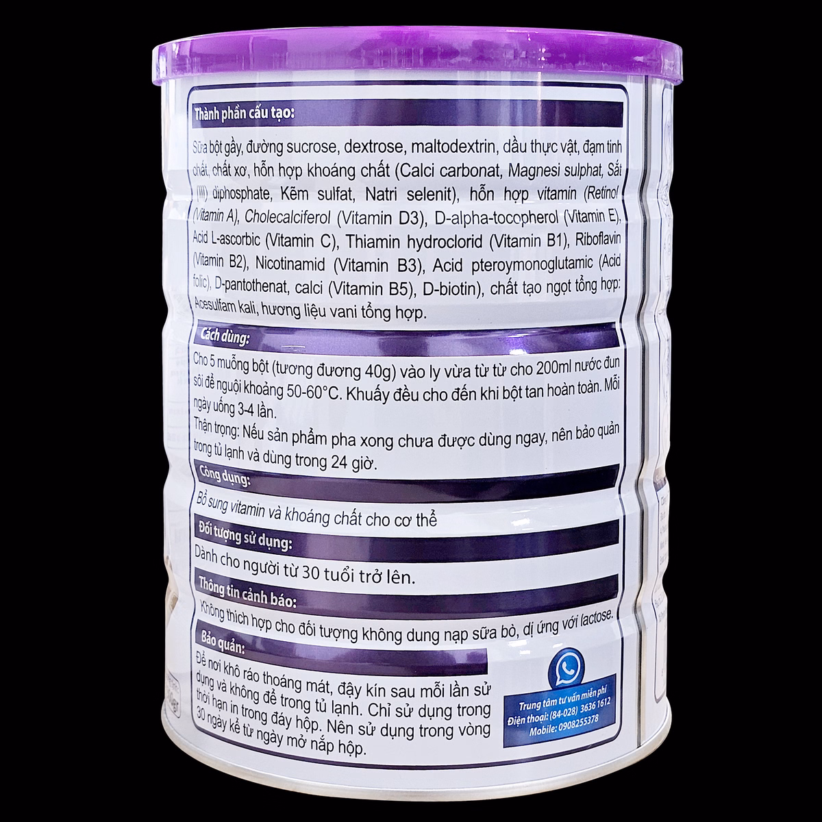 Sữa bột gầy, đường sucrose, dextrose, maltodextrin, dầu thực vật, đạm tinh – chất, chất xơ, hỗn hợp khoáng chất (Calci carbonat, Magnesi sulphat, Sắt …) diphosphate, Kẽm sulfat, Natri selenit), hỗn hợp vitamin (Retino (Vitamin A), Cholecalciferol (Vitamin D3), D-alpha-tocopherol (Vitamin E), Acid L-ascorbic (Vitamin C), Thiamin hydroclorid (Vitamin B1), Riboflavin (Vitamin B2), Nicotinamid (Vitamin B3), Acid pteroymonoglutamic (Acid folic), D-pantothenat, calci (Vitamin B5), D-biotin), chất tạo ngọt tổng hợp. Acesulfam kali, hương liệu vani tổng hợp.