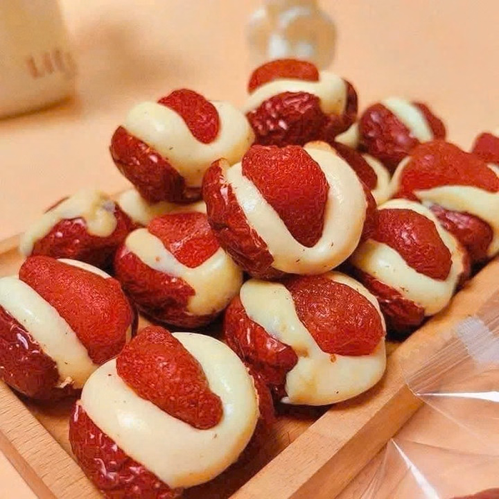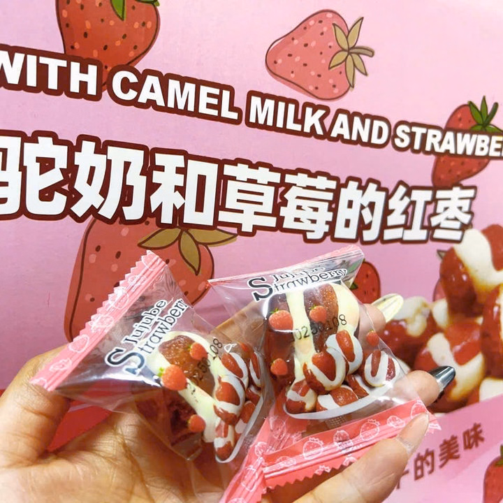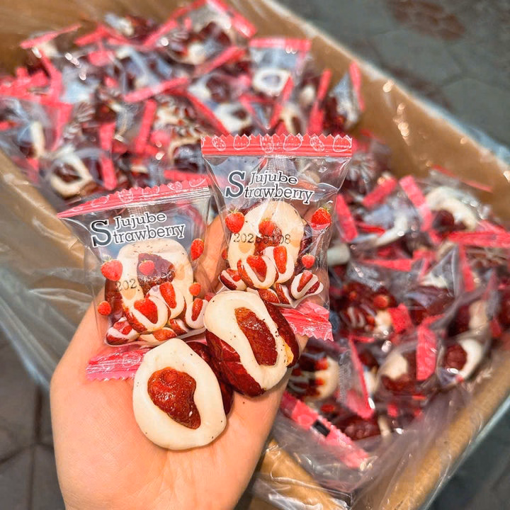 Táo đỏ kẹp sữa + dâu tây sấy dẻo . Ngon lắm ạ. Mùi thơm táo đỏ, sữa lạc đà hòa quyện với vị dâu tây phải nói là rất là hợp và cuốn luôn đó ạ. Các bác hãy thử 1 lần và cảm nhận đi nhaaa