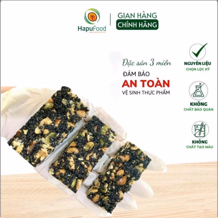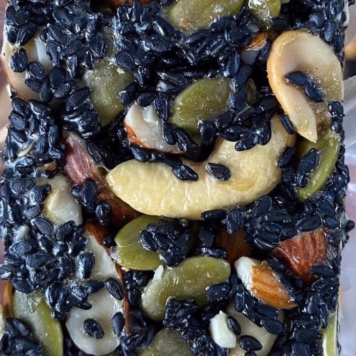 – Thành phần: Hạnh nhân, Hạt điều, Hạt bí xanh, Hạt vừng đen, Hạt đậu phộng, mật ong, dầu dừa, muối hồng.