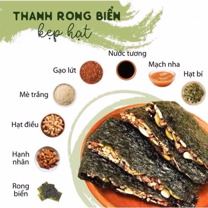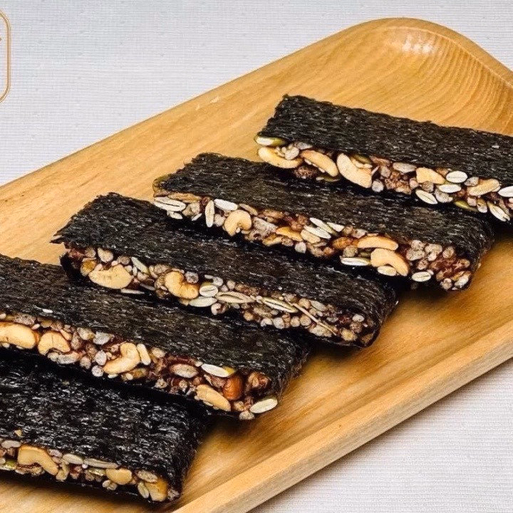 – Thanh rong biển kẹp hạt giòn tan là sản phẩm được làm từ các loại hạt như hạnh nhân, hạt điều, hạt bí xanh, hạt vừng trắng, đậu phộng, gạo lứt, mật ong, dầu dừa, rong biển và muối hồng. Sản phẩm có thời hạn sử dụng là 06 tháng và được sản xuất tại Việt Nam.