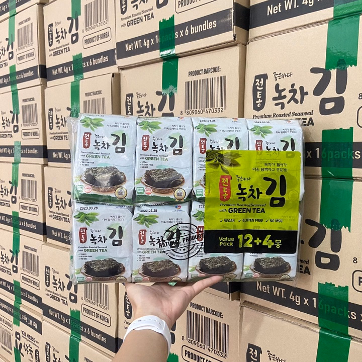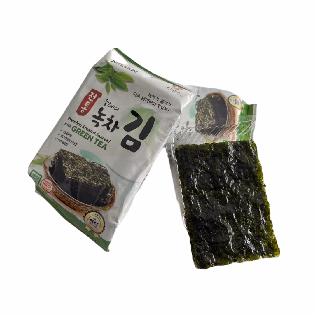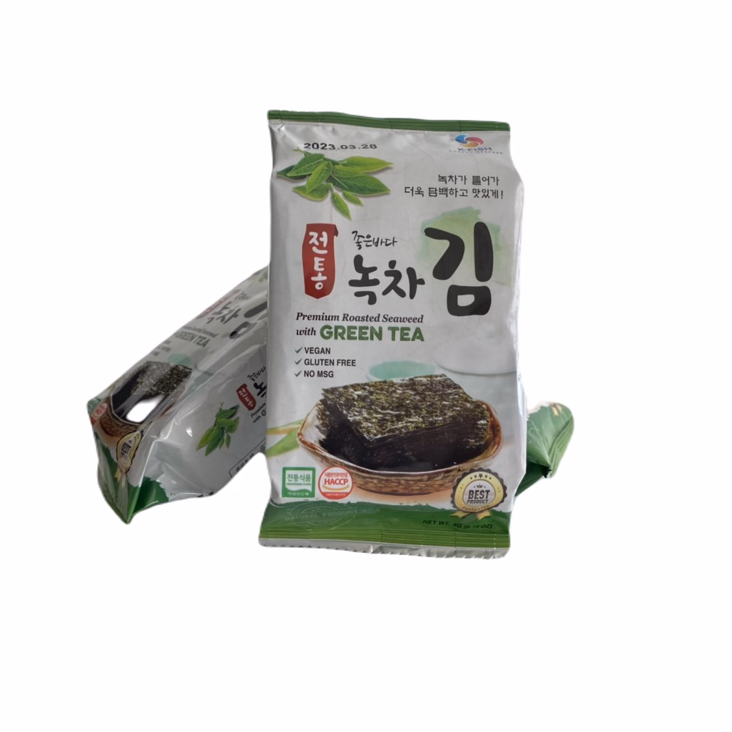 Rong biển sấy khô vị trà xanh Hàn Quốc là một nguyên liệu rất quen thuộc trong các món ăn của xứ kim chi. Hàm lượng protein trong rong biển rất cao, ngoài ra trong rong biển còn chứa đầy đủ 8 loại Axit Amin rất tốt cho sức khỏe.