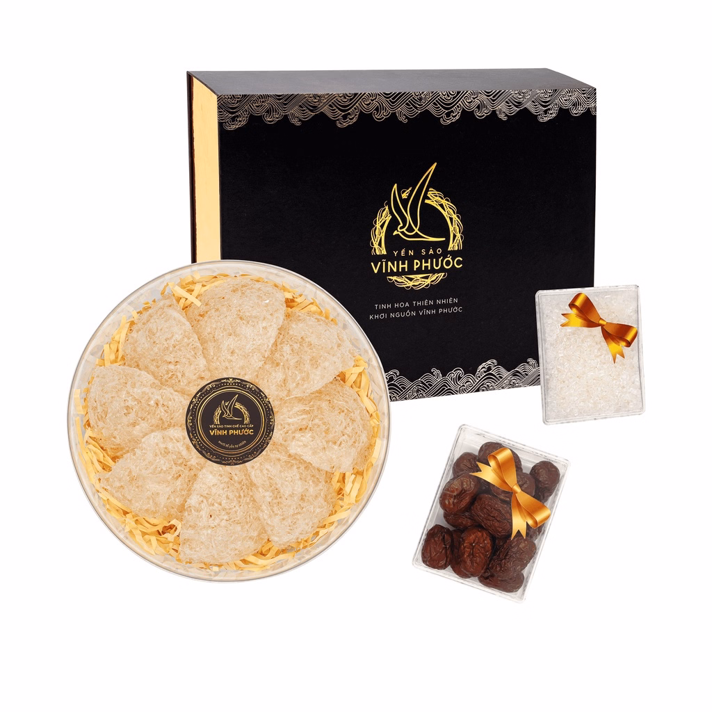 Đóng gói: 1 hộp 50g/100g Yến Sào Tinh Chế Cao Cấp Vĩnh Phước, 1 hộp 50g táo đỏ, 1 hộp 50g đường phèn