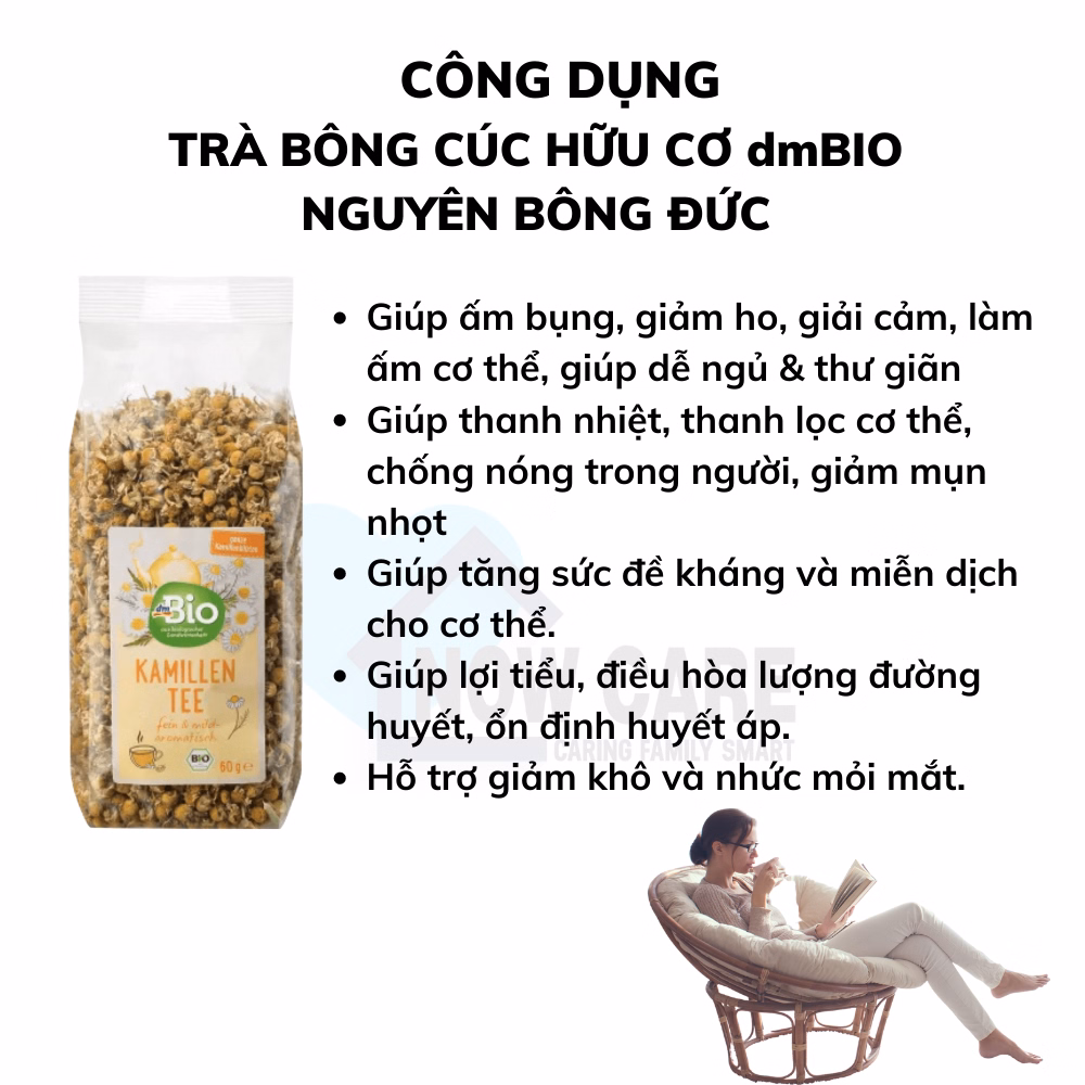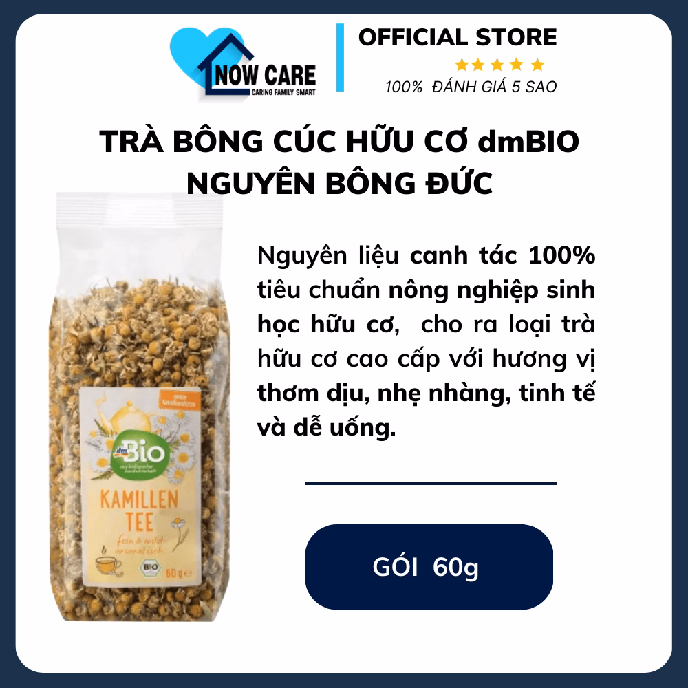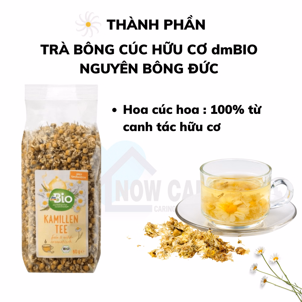 Với nguồn nguyên liệu được canh tác 100% tiêu chuẩn nông nghiệp sinh học hữu cơ tại Đức, trà bông cúc hữu cơ Dmbio nguyên bông làm từ những bông hoa Cúc La Mã, qua công nghệ hong sấy tự nhiên đạt chứng chỉ Eu, đã cho ra loại trà hữu cơ cao cấp. Trà có hương vị thơm dịu, nhẹ nhàng, tinh tế và dễ uống.