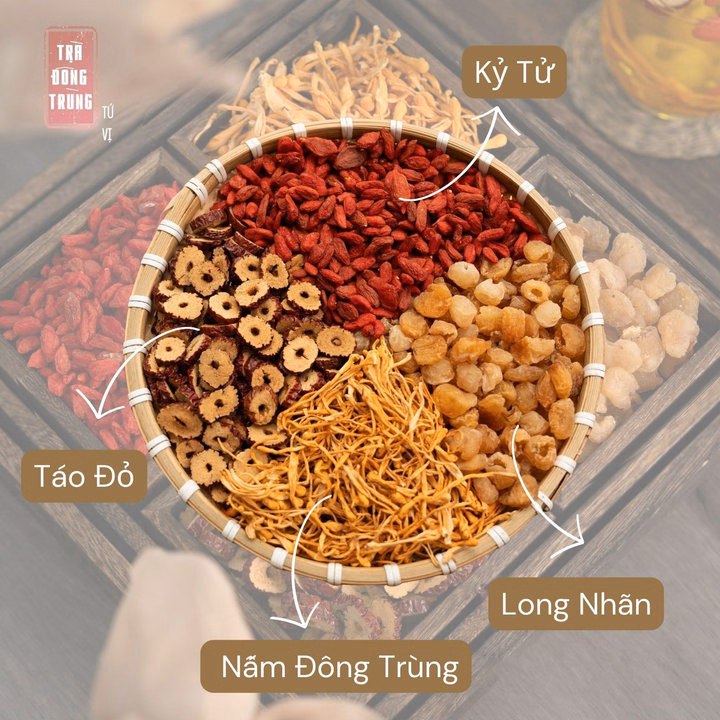 Thành phần: Nấm đông trùng hạ thảo, táo đỏ, long nhãn , kỷ tử